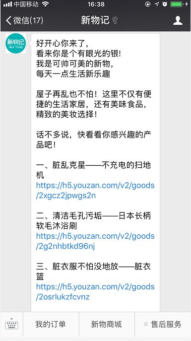 定制素材以实现精准触达 摒弃了单一素材无差别投放的传统广告形式,新物记根据不同人群定制直击痛点的内容并进行精准投放,是从流量优化到转化优化的进阶,正是在这样的投放思路指导下,新物记迅速吸引了大批目标用户。 流量无缝承接,粉丝效应最大化 为了更好的利用投放期间获得的流量,公众号的运营思路根据广告投放进行了调整优化。为了实现精准转化,新物记将关注后的自动回复由欢迎语换成了产品推荐,推荐的产品也选择了与广告关联度较高的产品,同时添加了购买链接,方便用户直接进入商城购买,缩短转化链条。