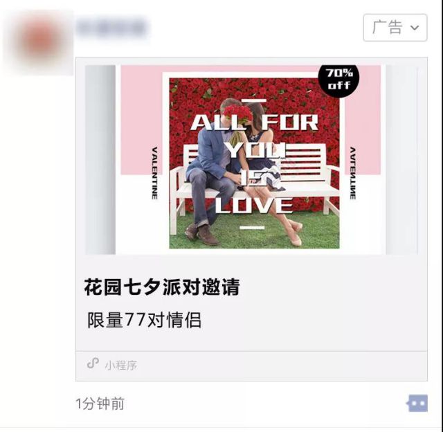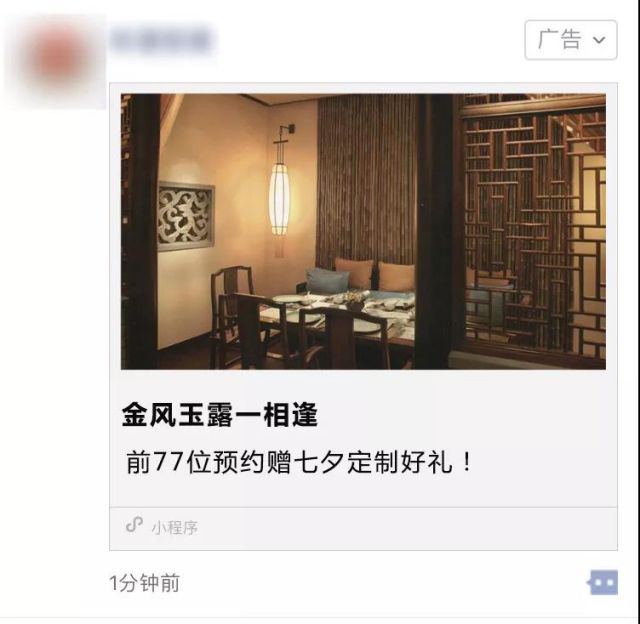 七夕作为中国传统节日,一直以来都是各个的重要节点,独具社交属性的也成为各大广告主的必争之地。在投放朋友圈广告时,广告主可以充分利用朋友圈广告的展现形式、功能组件、小程序等,在品牌曝光的同时有效提升转化。 餐饮酒店 酒店和餐厅向来是七夕消费的主力,浪漫优雅的环境和富有情调的菜品都有助于情感升温,颇受情侣欢迎。 酒店Tips: 酒店空间相对较大,更为适合布置七夕节日场景,一般而言可推出七夕花园派对等主题活动。酒店用餐消费相对比较高昂,目标人群大多为消费能力较强的用户,更注重生活品质以及节日仪式感,因此亦可结合限量定制礼品活动进行推广。