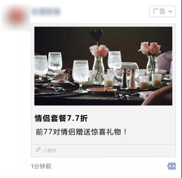 标签选择:汽车、房产、金融、餐饮服务 外层文案:活动、情怀、特色、环境 外层画面:宣传视频、活动照片 西餐厅Tips: 大多西餐厅则更注重浪漫的节日气氛,活动更多偏向于推出“情侣套餐”、“七夕套餐”等节日套餐或是价格优惠活动,外层画面可以更侧重食物特写或者现场浪漫气氛,以本地推广的广告形式更佳。