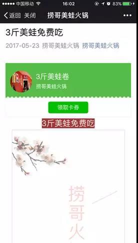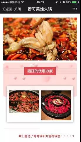 腾讯朋友圈本地推危机公关经典案例论文广,一直以来致力于为本地商户用更小成本获得更多客源。而本地推广到底能达到什么效果,“舌尖上的美味”给出了炒鸡满意的答卷。 捞哥美蛙火锅,引自源于舌尖上的中国重庆百年秘方神秘火锅,营养丰富,味道鲜美,让身在南昌的小伙伴也能感受地道重庆美蛙火锅! 卡券+优惠信息+多重定向=活动大获成功 首先,美蛙火锅用朋友圈本地推广广告,精准定位了门店周边的人群。再通过外层场景图片+内层详情的形式,展示其餐厅特点,独具地方特色的美食,吸引更多美食爱好者来此用餐,并通过朋友圈本身的社交功能增强曝光,吸引更多潜在用户到店消费。 其次,在地域定向上,南昌美蛙火锅上海路店选择了其半径5KM的用户,将目标锁定为22-45岁对美食极感兴趣的这一部分人群。 外层文案:明确了直接的优惠信息,吸引大量美食爱好者的点击 外层图片:具有视觉诱惑力的美蛙美食图片,提升品牌好感,增加到店欲望 优惠券领取:直接的优惠券领取路径,操作简单方便,无形中增加到店转化率