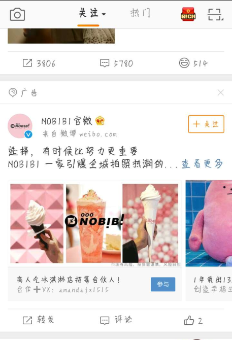 NOBIBI是一个冰淇淋品牌,下图是它在微博上的一个广告样式,穿插在微博内容里,是一个三图的信息流广告样式。以“选择,有时候比努力更重要,NOBIBI一家引爆全城拍照热潮的……”这种叙述性文案,凸显NOBIBI冰淇淋的特别,可以引领全城拍照的热潮。图片选择的也很有创意,吸引人的眼球,图片上是NOBIBI的标志。图片下面是NOBIBI冰淇淋的一个招募合伙人的活动。 投放页面:微博关注页面推广平台哪儿有怎么做信息流 目标人群提高快手转化率:喜爱冰淇淋并追求独特的人 广告目的:进入查看页面,点击参与按钮了解详情 ![]()