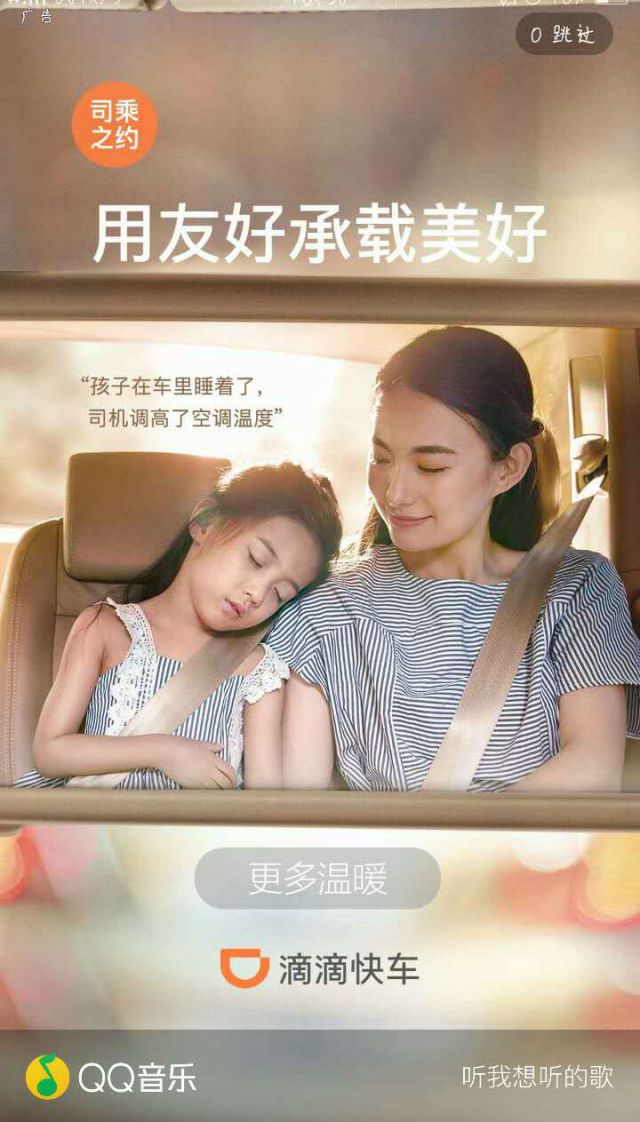 这是一张滴滴快车在QQ音乐上做的一个广告样式,广告的展示位置是打开QQ音乐时的开屏广告,运用大图模式来来进行展现。文案是“孩子在车里睡着了,司机调高了空调温度”,浅显易懂,运用生活中都会发生的一件小事,来体现滴滴快车的主题“温暖”。用友好承载美好这一句简单的话表现滴滴快车的服务态数字化营销度,以“友好、温暖”为主要产品软文广告推广2020年发生的公关危机。 投放页面:QQ音乐开屏广告信息流 目标人群:外出打车的用户 广告目的:运用滴滴快车 ![]()