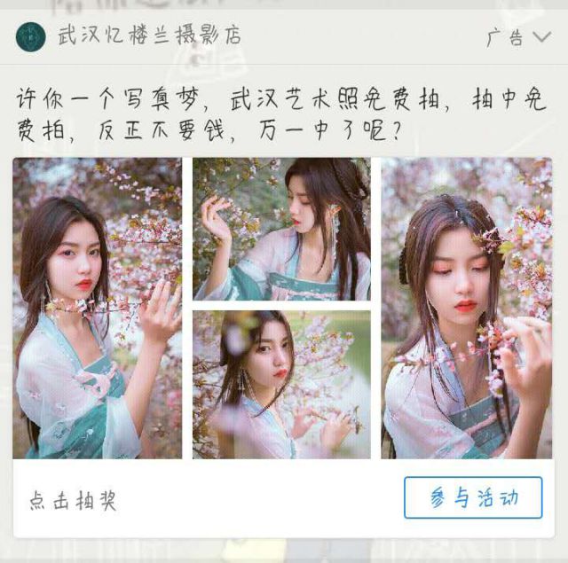 这是武汉忆楼兰在QQ空间里面做的一个摄影广告,以拼图的信息流广告样式穿插在内容页面。文案是“许你一个写真梦,武汉艺术照免费抽,抽中免费拍,反正不要钱牛奶危机公关策划,万一中了呢?”用免费促销来吸引用户。图片美轮美奂,用女子穿古装在桃花下的一组写真照片,拍摄她的各个角度,来凸显忆楼兰摄影店的高超技术,以此来吸线上引流方法引热爱古风写真的女子。 投放页面:QQ空间内容页面信息流 目标人群:热爱拍艺术照片的人 广告目的:点击抽奖,参与此次活动 您如果有投放腾讯社交信息流广告的需求公关危机专家,可以点击下方按钮,与我们联系。