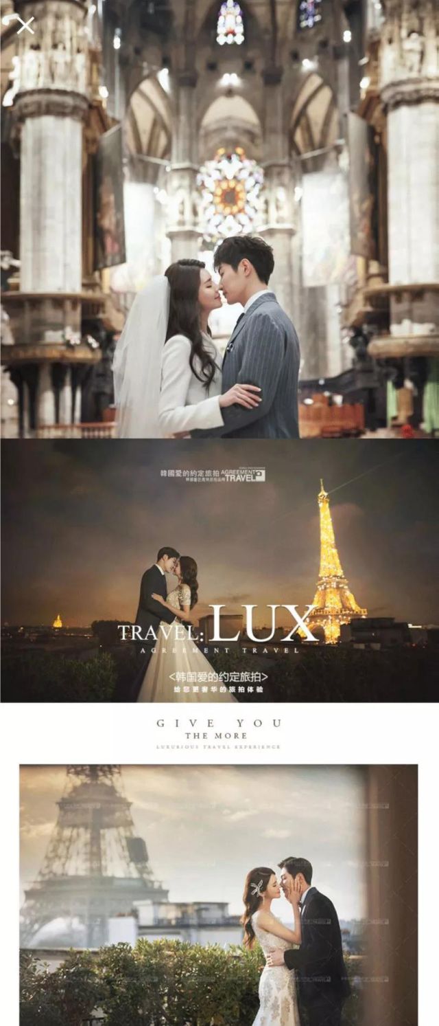 本次投放绝大部分消耗来源于普通婚纱摄影表单广告,以下为其中一条广告数据详情,由于素材使用较为网站网站开发的优质,因此获得较高点击率,平均点击率都在7.8左右。 投放数据: 曝光次数164512;点击次数12966;点击率7.875%; 2.高档旅拍摄影 高档旅拍定制,价格较为昂贵,目标用户多为一线城市具有一定消费力的人群。 外层文案告别普通婚纱摄影广告文案,形式较为固定,表明旅拍国家,由于投放人群相对高端,减少使用引导性词汇,更多是展现作品质量;内层页面多以客片为主,且品质较高。