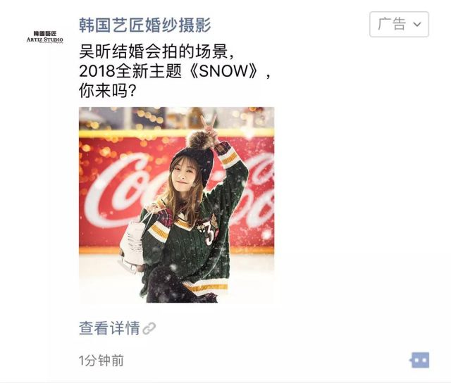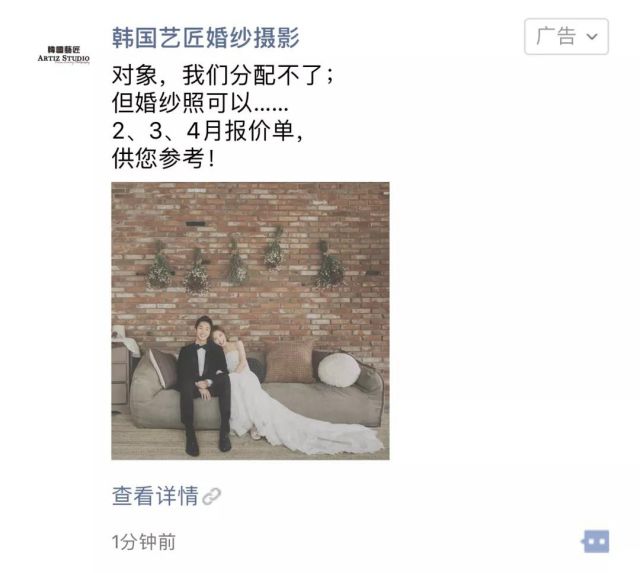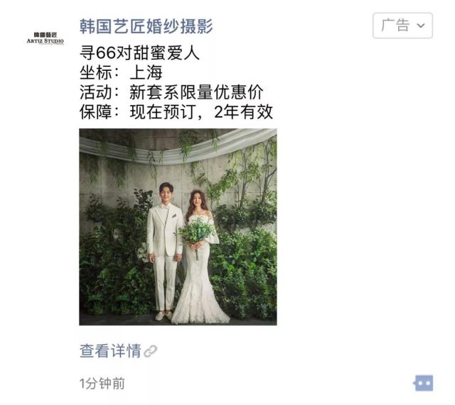 小提示:您应该对本页介绍的“微信朋友圈广告:让韩国艺匠等婚纱摄影行业精准”相关内容感兴趣,若您有相关需求欢迎拨打我们的服务热线或留言咨询,我们尽快与您联系沟通微信朋友圈广告:让韩国艺匠等婚纱摄影行业精准的相关事宜。