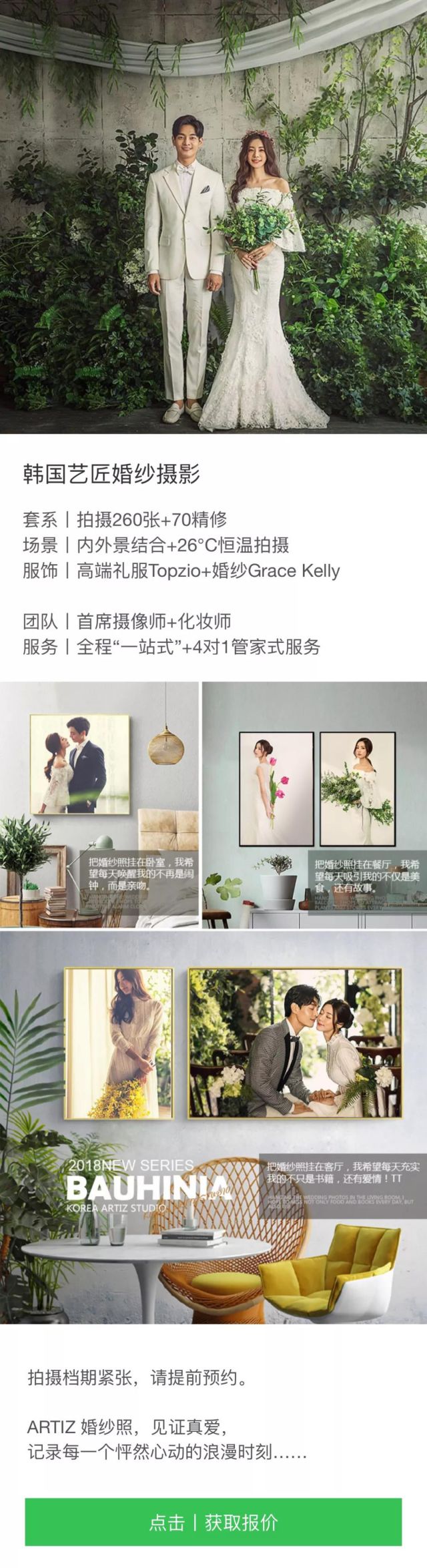 拍婚纱照是结婚大事中事关重要的一项,市场上各家拍摄水平参差不齐,传统品牌推广获取客户有限。 韩国艺匠ARTIZ STUDIO自身在婚纱照领域有着不可忽视的影响,在洛杉矶、首尔、新加坡、上海等地,曾引起一场婚纱照革命,尽管价格比其他品牌贵上数倍,但自从携手优矩借助,韩国艺匠不仅获取了更多的客源,在品牌形象和知名度上也有广泛的传播。 投放目的 表单收集、获取课资、品牌宣传、提高知名度。 营销模式及效果 韩国艺匠针对不同消费人群,推出三种质量、主题和场景不同的套餐服务,对应高、中、低三种价格。定位不同,客户群体也不同,定向投放人群和地域范围要根据实际进行分析判断,选择更精准的投放组合。 1.普通婚纱摄影 普通全网营销策划方案婚纱照拍摄,价格较为低廉,目标用户广泛。 文案大量使用通灰帽SEO配符,即投放上海就体现上海地区、投放北京就体现北京地区。外层文案体现最新的报价单吸引客户点击。内层素材以展现客照为主,体现套餐内容。
