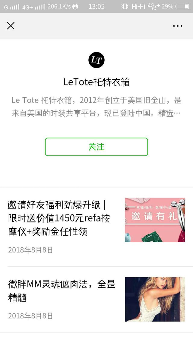 看到案例,我们可以获取到以下信息: 1、广告主是谁? LeTote托特衣箱 2、能帮我们解决什么问题? 服装搭配难,会国家地区限制,大牌服装价格贵,买一件就只能是一件,时间长了无新意。LeTote托特衣箱可以用一件大牌衣服的价格来换取时装任意穿,只需三天即可变身时尚女王。让你每个月都光鲜亮丽,每天穿搭各不同! 3、推广目标是什么? 从图片中,我们可以看出推广目标就是关注LeTote托特衣箱的公众号。 点击【了解公众号】以后,会进入公众号关注页面,如下图。