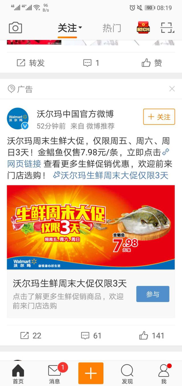 沃尔玛一直在中国市场积极开发和推广沃尔玛“自有品牌”,推出“质优价更优”的自有品牌商品,覆盖了食品、家居用品、服装、鞋类等主打品类。沃尔玛主打三个品牌:食品非食品;家居用品;服装用品,由于省去了许多中间环节,特别是广告推广和超市入场费,并通过规模效益降低销售成本,自有品牌产品通常具有明显的低价格、高品质的竞争优势。 超市大家都知道食品安全是非常重视得问题,现在的人都是通过互联网知道热点时事,获取信息,想要让更多的用户来购买商品,就需要在网上打广告,沃尔玛利用要做电视广告微博的优势来投放广告,利用周末双休,来一场生鲜大促销,一条金鲳鱼7.98元,超低的广告对于顾信息流广告游戏行业客吸引力非常大,吃是人们生活中不可缺少的必需品,所以在食品这方面的广告会大大的吸引用户购买的欲望。 微博拥有海量用户资源,用户覆盖全国各个城市和地区,给微博广告传递提供了更广的范围,广告曝光高,能够吸引更多的意向客户和潜在粉丝。微博日活跃量高达1.9亿,打开次数多,意味着广告曝光率会提高,用户关注度增加。 ![]()