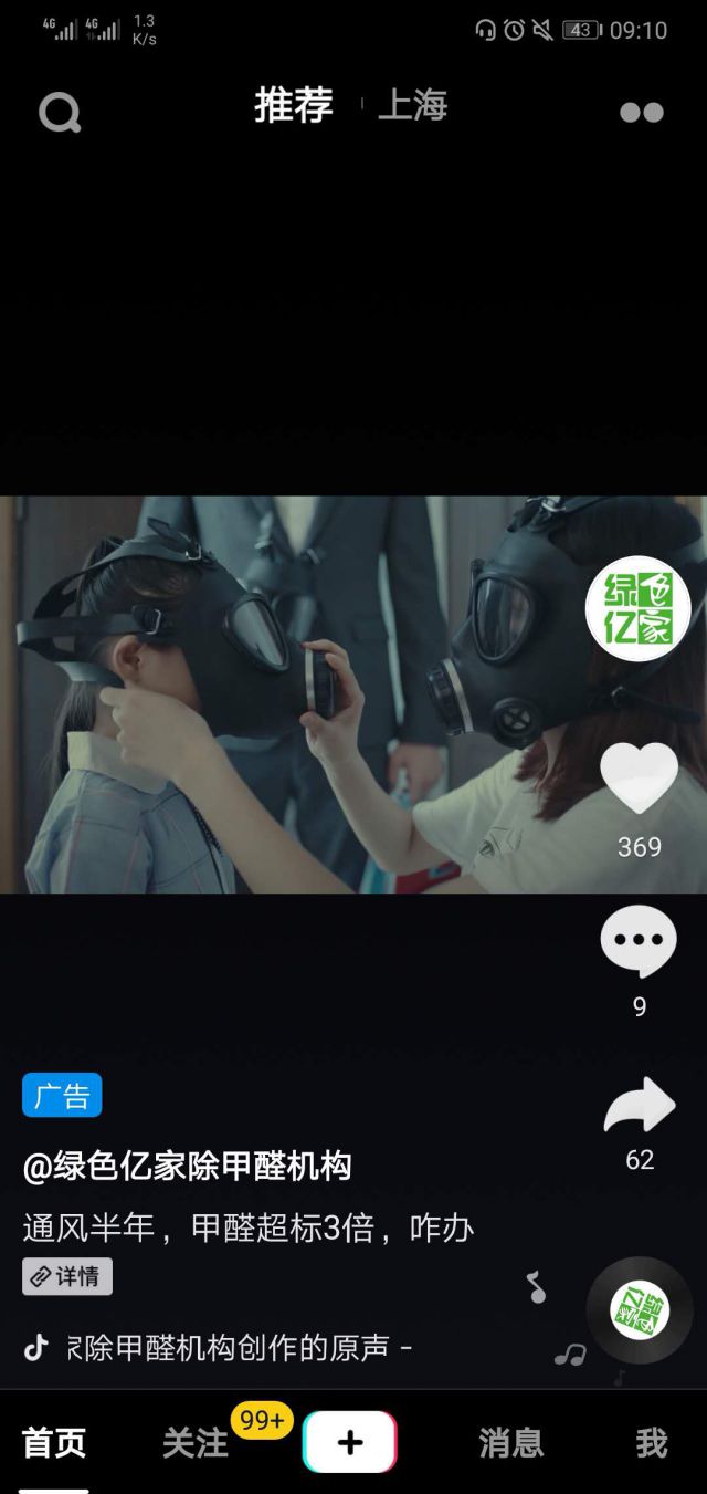 现在越来越多的人面临着,新房装修好,不敢进去住,千挑万选的环保材料,最终还是甲醛超标,随着人们健康意识的提高,住宅室内空气质量也越来越受重视。 在绿色亿家这则宣传广告中,通风半年,甲醛依旧超标3倍,怎么办?一家三口回到家就要戴上厚厚的防毒面具,为了健康,在这个家里带上各自面具,做着各自的事情,这个视频直戳消费者心理,我们每天住的新家投放抖音广告到底存在多少危害我们身心健康的东西。 绿色亿家这则新颖且一针见血,选择投放抖音的原因?抖音逐渐成为年轻人新宠,并随电视广告列表之拍的宣传片的不断带火大量产品销量,几乎所有品牌主的眼睛都亮了,纷纷加入这片新战场,希望将抖音的巨大商业价值快速利用到中。抖音用户数量庞大,能够将目标细分,根据年龄、喜欢、地域,精准抓住需求,吸引用户眼球。通过点赞、评论转发追踪广告实时效果,提高品牌曝光率以及知名度。 ![]()