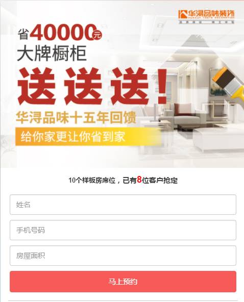 修改后的落地页,整体简洁大方,配色舒适醒目 “送送送”醒目,优惠活动突出,直击用户痛点; 第一屏即有表单,程度减少用户流失; “已有8位客户枪定”,需求刺激,促使用户填表单。