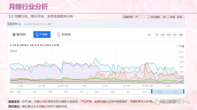 为期一个月指数中可以了解到,在PC端,月嫂公司在搜索呈现大幅度上涨趋势,产妇护理,金牌月嫂在近两年搜索稳定,月嫂和新生儿护理也呈现波动上涨趋势。之后会建议企业重点关注月嫂公司在PC端的投放。