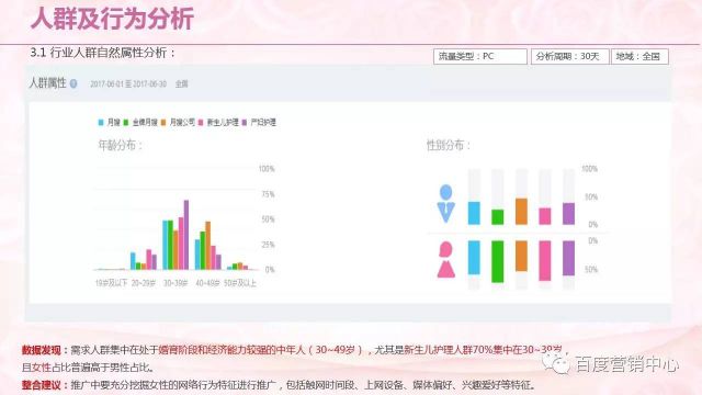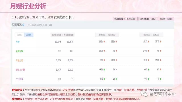 还有就是近30天的同比和环比数据,产妇护理的搜索需求同环比均呈现下降趋势,而月嫂、金牌月嫂、月嫂公司的搜索需求同环比都呈现上升趋势,特别是比赛的宣传海报月嫂和金牌月嫂呈现大幅度上升趋势,整体比较偏向移动端获取信息。后期将推荐企业重点关注月嫂,金牌月嫂,月嫂公司在移动端媒体的投放。