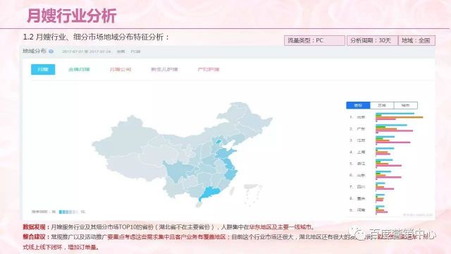 从地域分布图可以看出月嫂服务的业务主要分布在沿海城市,这个展示的是前九个重点的省份,湖北地区没有列到前九当中的,在湖北当地,武汉是有很大的提升空间。在以后的推广通过线上线下注重自身品牌的建设。