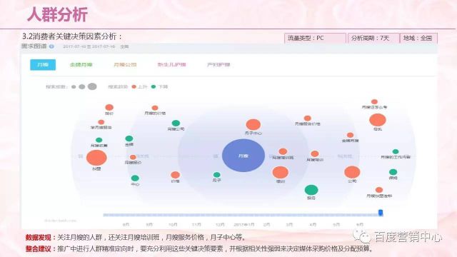 从月嫂关键词上下游检索分析,网民除了关注月子中心,月嫂培训班之外,他们还需要通过58进行检测,在图片的表达上和设计上,包括月子中心,还有价格类做一个表达。