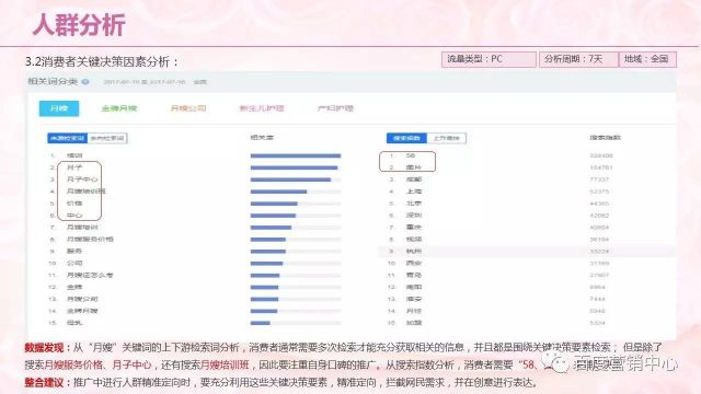 平时搜索“月嫂”相关词的用户还会关注哪些词呢?月子中心,月嫂服务价格,金牌服务,在推广中要注重相关词的设置。 从月嫂关键词上下游检索分析,网民除了关注月子中心,月嫂培训班之外,他们还需要通过58进行检测,在图片的表达上和设计上,包括月子中心,还有价格类做一个表达。