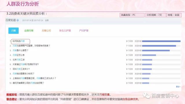 在知道频道上搜索关注比较多的,除了“如何挑选月嫂”,还有可能关注的也是月嫂的质量。在后期要充分利用知识营销平台进行口碑的建设,在创业中也要对客户自身的品牌优势进行强调。
