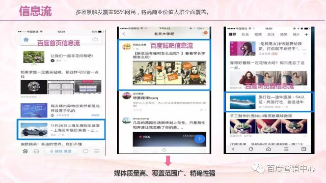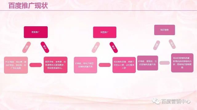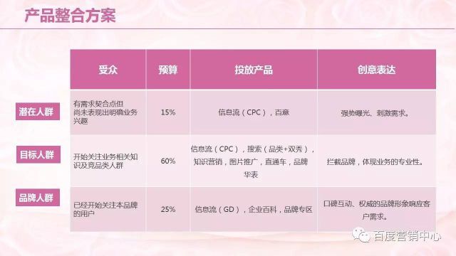 针对如此的推广现状,帐户如何做整合营销方案呢? 主要是从潜在人群、目标人群、品牌人群三部分进行预算的合理分配。 潜在人群,要使用信息流,要通过信息流和百意两款产品帮助客户提升更多的曝光。 目标人群,使用知识营销产品,加强本地直通车,包括其他产品结合使用,帮助客户体现自身的优势,包括价格、服务特色。 品牌人群,企业百科,品牌起跑线,产品的结合使用,帮助客户建设品牌形象。