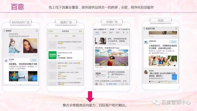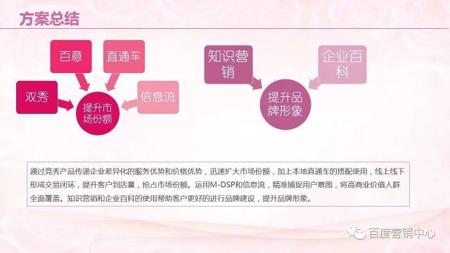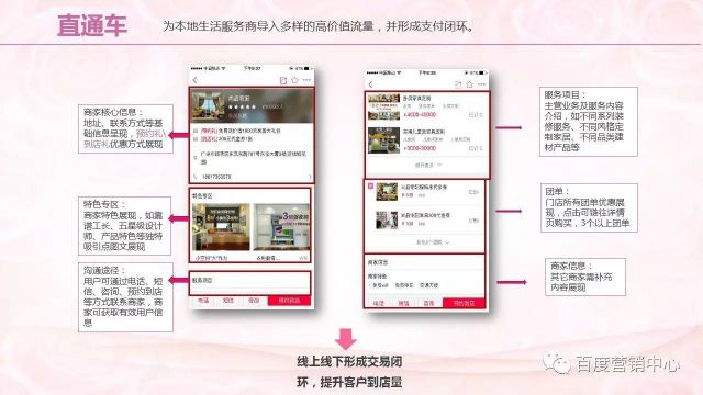 百意&信息流:通过百意和信息流精准的根据行业的数据得出来的,目标人群在30-39岁的女性,我们要通过百意、信息流量款产品,将这类人群精准的锁定。 直通车:可以有公司的一些特色体现,例如,近期的活动都可以展现,转化的一些按纽,包括电话、短信、咨询按纽,可以帮助客户、商户进行有效的获取用户的信息。通过线上和线下的交易闭环,帮助客户提升到店量。