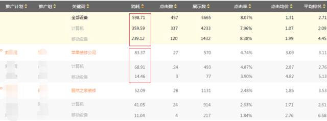 例如关键词“苹果装修公司”整体消耗83.37,但实际投放计算机消耗68.91,pc消耗占比82.66%,移动消耗占比17.34%,关键词无线占比低于整个账户无线占比,且目前客户所属行业无线占比65%左右,客户投放方向应侧重移动端优化,因此账户重点调整提升移动端消耗。 优化中,首先提升移动比例,保证在移动端的展现,提升点击; ▼2.低点击高转化--提点击 这类关键词重点提升点击量,向第一象限靠拢。可以通过关键词报告查看关键词的平均排名,将排名≥3的关键词,优先提升出价。