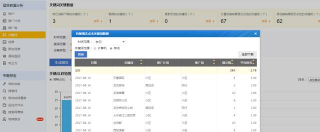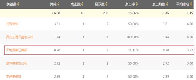 例如关键词“天地源曲江香都”展现较好,但是点击率低于整体账户点击率,主要排查问题目前排名为3.57,需要优先提升这类关键词的价格。 ▼3.低点击低转化--恢复点击 这类词很有可能是由于排名不好或者创意不好导致点击机会较少,可以通过有展现无点击报告指导优化。 使用方法:根据目前实时数据排名优化,提升点击。平均排名>=3,提升排名;排名<=3,优化创意。 报告入口:推广管理>数据报告>关键词>有展示无点击报告