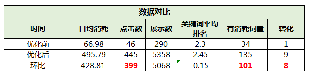 ▼4.高点击低转化--重点转移 这类关键词是最头痛的一类词--费钱且没有效果。从四象限中很清晰的看出,这类词几乎都是竞品词。说明竞品词本身商业价值较低,网民不认可,无法产生咨询,这类词直接调低价格即可。这样可以把预算分配到其他高价值词上。 优化前后数据对比 两周时间内,咨询增加8个,有消耗词量增加3倍,流量提升非常明显。