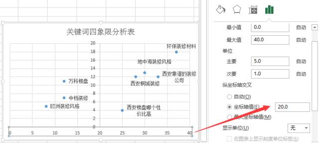 4、调整横纵坐标轴。 点击散点图的坐标轴,右键选择“设置坐标轴格式”,根据实际数据(一般是取中间值),分别设置X轴、Y轴坐标交叉值。 如下图,点击横坐标,坐标轴值选择中间值20。纵坐标方法同理。