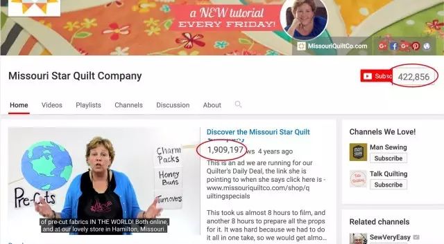今天小编要向大家介绍一位特殊的美国网红,她在YouTube上的频道有42万多粉丝,每个视频都有100,000+甚至百万的点击——这位网红就是下面这位其貌不扬的美国大妈! Jenny大妈不但是YouTube红人,而且还是世界上最大的手缝被材料公司“密苏里之星”的老板之一,是妥妥的人生赢家。然而,在2008年时金融危机遇上中年危机,她和丈夫的退休金账户几乎清零,他们找不到任何工作……Jenny大妈在不得已的情况下开始创业,成立“密苏里之星”手缝被公司,公司出售各种做被子用的花纹布料,大多数是已经初步剪裁好的半成品,顾客买了他们的布料后可以自己缝制被子。 公司的成立并没有让这个跌入谷底的家庭有起色,他们所在的小镇人口少、经济差,来门店买他们布料的人很少,因此他们必须依靠线上商城带来销售额才可能有转机;但想做电商广告预算又捉襟见肘,该怎么办呢? YouTube让小人物成为大明星 他们想到了制作手缝被的视频教程放到YouTube上,并使用推广自己的视频,没想到一炮而红,他们的频道成为YouTube上最受欢迎的手缝被频道,公司的电商生意也蒸蒸日上 。