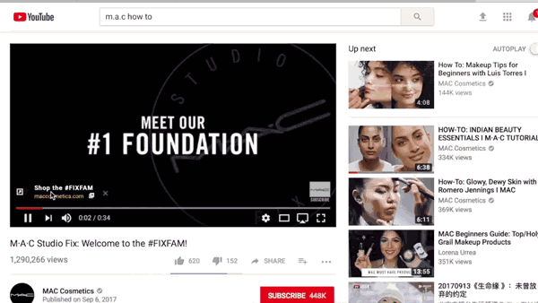 美妆品牌M·A·C与YouTube合作,在YouTube上发布了一系列如何化妆的教学视频,并内嵌进往上商城页面中,观看视频的观众还可通过上面的链接直接进入M·A·C网上商城购买产品。不仅如此,YouTube还能根据观众所在地区自动选择他们所看到的视频语言和进入本地电商 。比如巴西的观众会直接看到葡萄牙语的视频,并进入巴西的M·A·C网上商城。
