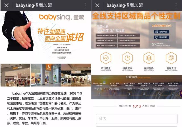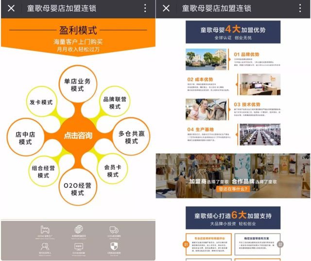 优化后的落地页:设计醒目,亮点清晰 落地页清晰、完整地向目标人群展示了“童歌母婴店”连锁品牌的优势:包括品牌规模和所获资质认证,“线上线下结合”的财富和盈利模式解读,以及加盟童歌品牌可获得的全方位支持等丰富内容。表单位置靠前,在品牌基本信息后第一时间呈现,最大可能抓住潜在客户。 在广告创意方面,加入了更打动人心的元素。母婴类产品着重强调“温馨”的感觉,通过店铺图片的展示,让目标人群有极强的代入感。广告标题上,优化前是“童歌品牌母婴店诚招加盟”,更新后,更聚焦“潜在用户群体”的关注点,使用“招商加盟”、“童歌”、“母婴”、“80/90创业”、“优选”等关键词。