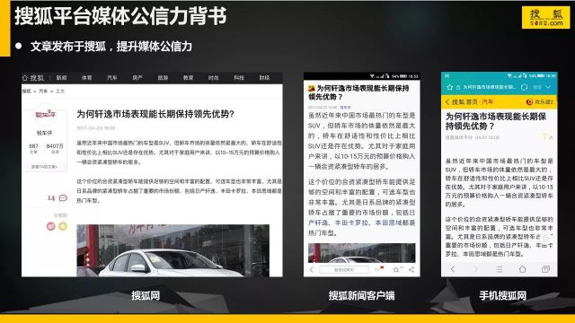 竞品卡罗拉的改款上市,使得东风日产轩逸面临着直接的市场挑战。对此,轩逸1.6L选择了在今年四到五月期间以促销应对,通过制造不同品牌产品之间PK的热点话题,吸引用户关注,深度影响高质量潜在消费者的购车偏好,为品牌锻造口碑。 多赢自媒体合作平台 为轩逸成功打造“智能科技”口碑 为了吊起用户的胃口投其所好,需要先准确洞察品牌潜在用户的特征。轩逸的目标人群定位为不断进取、自信的新生代智趣家庭用户。其明显特征是:重视陪伴,与家人关系密切;追求新鲜科技与潮流消费;热衷于全家一起酷玩,尽情探索生活乐趣。 光有品牌产品之间正面交锋的热点事件还不够,在传播环节也要放大声量,第一时间影响轩逸的目标用户。 于是,在品牌传播渠道的选择上,考虑到自媒体营销的效果和趋势日渐得到客户认可,同时运用海量自媒体碎片化阅读推荐,可以帮助品牌信息在短时间内形成一定的舆论热度。因此,搜狐多赢自媒体商业合作平台为轩逸量身打造了自媒体的内容营销,从多角度产出鲜活内容,并选择多平台海量传播,在短期内成功制造了舆论攻势。 首先,轩逸选择了垂直领域的知名自媒体为品牌原创精品内容,量身打造,突大众危机公关出轩逸的产品特性,用细节打动用户。随后在用户聚集的主路径上对原生内容进行海量分发,覆盖了PC端、APP端和WAP端三端的用户。通过借力搜狐多赢自媒体平台,让轩逸品牌与自媒体的合作更加有效率,成本可控,同时达到强大的传播分发效果。