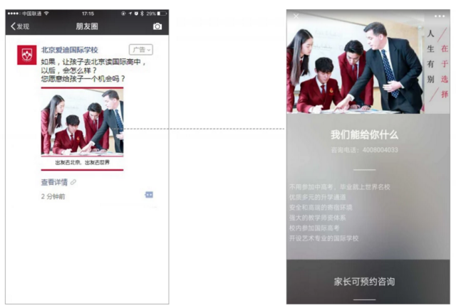 品牌故事:北京爱迪(国际)学校,是由澳大利亚教育发展集团投资创办的国际学校,为中国境内中、外籍学生系统提供双语幼儿园、双语小学、双语初中、全英文澳大利亚高中(WACE)、大学预科、大学文凭、本科及雅思英语课程,课程完全与澳大利亚接轨,文凭和学位广受国际认可。 营销痛点:作为学费较高的高端国际学校,北京爱迪(国际)学校面向的目标受众群相对有限,时常面临生源量不足的招生瓶颈。因学校校区主要分布于北京、河北、内蒙古等全国重点省市,且推广预算有限,北京爱迪(国际)学校对广告投放精准度有较高要求。以往尝试投放的线上竞价搜索广告,难以有效控制广告投放成本,无法满足各校区的招生需求。 营销目标:北京爱迪(国际)网网站开发设计学校希望根据校区分布,精准触达多个城市、不同地域的目标人群,深入传达与展示学校的教学理念与环境优势,让更多学生家长了解爱迪学校。同时,在积累学校知名度的基础上,北京爱迪(国际)学校力求吸引更多目标受众主动咨询与分享互动,提升客咨收集效率,并通过后期跟进,促进生源转化,提升品牌市场占有率。 投放方案: 巧用人群定向,多维度触达不同地区目标受众 在腾讯社交广告区域核心服务商,北京广联先锋技术有限公司的建议下,北京爱迪(国际)学校针对其校区主要分布地 &m推广营销有哪些dash;— 河北、内蒙古、山西投放微信朋友圈广告,并选取高收入人群汇聚的呼和浩特、太原、大同等一二线城市集中推广。此外,北京爱迪(国际)学校还通过丰富的人群定向,选择关注中小学教育、出国留学、移民, 汽车、别墅豪宅的用户,以精准触达39-48岁之间、拥有较高收入的目标消费群体。 外层设计贴合用户需求,内层表单带动转化提升 北京爱迪国际学校投放原生推广页广告,以“定制你未来”为广告主题,以外教授课场景为图片素材,直观展示学校教学优势与环境,传达学校理念,贴合大多父母为子女择校时的核心关注点,引发潜在目标消费群体的关注与互动。广告内层上,北京爱迪(国际)学校借助信息收集页模板,在提炼、呈现学校亮点的同时,引导感兴趣用户填写个人信息进行咨询,全面促进潜客信息收集效率,提升广告转化效果,稳定获客成本。
