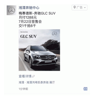 品牌故事:作为湘潭唯一一家梅赛德斯-奔驰授权经销商,湘潭华星锦业奔驰4S店主要经营梅赛德斯-奔驰(国产/进口)乘务车和商务车,提供汽车销售、金融贷款、二手车置换、保险上牌、汽车售后等一站式服务。 营销痛点 对于豪华车经销商而言,电视、电台、地推、垂直汽车网站等都是常规的推广渠道,然而通过一定时间的投放,广告主却发现传统渠道的传播效果在逐渐降低。 营销目标 今年7月22日,借梅赛德斯-奔驰GLC SUV新车型上市契机,湘潭华星锦业举办了一场优惠签售活动,以达到扩大知名度、促进销售的目标。湘潭华星锦业希望通过当下热门的社交媒体平台,尝试全新的推黑龙江卫视广告广渠道,进而获得更好的推广效果。在拥有了足够曝光量做依托的背景下,还要有足够的吸引力把潜客带到签宣传片简介售活动现场,促成他们的购买行为。 投放方案 精确锁定更多潜客 依托微信平台的海量用户,微信朋友圈可以为湘潭华星锦业提供足够的曝光量——此次推广,湘潭华星锦业的预算为5000元,基于这样的预算设置,腾讯社交广告优化师建议将广告覆盖在整个湘潭市,只将人群年龄限定在22-55岁,不做人群兴趣的限制,从而达到更好的曝光效果,再加上新颖的展现形式、丰富的落地页功能,这一切都成为了此次传播获得成功的基础。 外层广告抓人眼球 湘潭华星锦业的朋友圈广告素材,使用了新款奔驰GLC SUV的官方产品图,画面精美,主题突出,符合奔驰品牌的市场定位。而品质感十足的奔驰汽车本就抓人眼球,再配合上文案标明的优惠力度——交1千抵6千,更能吸引潜在客户的关注和点击。 在广告图片下方还可以显示门店名称,点击之后可直接在地图上看到门店具体位置,方便用户进店试驾与购买。在优化师的建议下,湘潭华星锦业还在此花了一点“小心思”:一般的4S店会在此处显示“XXXX汽车销售服务有限公司“,而湘潭华星锦业展示的则是“奔驰展厅”字样,这样一方面可以展现4S店的专业性,另一方面可以弱化“销售”的成分,避免用户产生抵触心理。