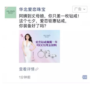 3、吸睛的创意视频、精准的定向设置,加上朋友圈巨大的用户基数,此次投放的曝光量和视频播放量分别达到498万和602万。 4、当用户被外层广告吸引,点击后即可进入华丽且精美的落地页。在落地页中,不仅可以进一步观看完整广告视频,更可以看到一系列优惠促销活动。无论是精美的珠宝设计,还是“100%现金回购”的优惠活动,都在不停地撩拨着用户的心弦。更小红书推广笔记重要的是,在页面最后,用户可以轻松地点击按钮领取没有任何使用限制的500元购物券,直接刺激了消费者的购买欲望。 本地推广、十足优惠促进店,让销售节节攀升 视频广告做铺垫,用户已经对爱恋珠宝产生了很深的认知与好感,并且领取了价值500元的优惠券,品牌需要乘胜追击,把消费者的好感、品牌的价值转换为更为实在的销售数字。 爱恋珠宝打出了一套漂亮的“组合拳”:在上线视频广告的同时,利用朋友圈本地推广、竞价广告,将更加详尽的优惠信息推送给了门店周边或门店所在地区的用户——在爱恋珠宝门店周边或门店所在地区的用户七夕期间不仅会看到视频广告,还有机会进一步了解爱恋品牌及热门的优惠活动。
