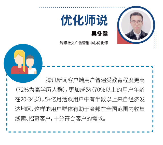 在投放时,奢邦将广告覆盖到了重庆、北京、天津、贵州、湖南、湖北、黑龙江、江西、吉林、四川等省市——这样的选择主要是考虑到这些地区来往丽江相对方便,而且在测试中有不错的投放效果。最终,在腾讯新闻广告的投放取得了良好的效果:在2017年11月一个月的投放中,日均曝光量超过10万,日均可获得20-30个销售线索,有效率达到了40%-50%。