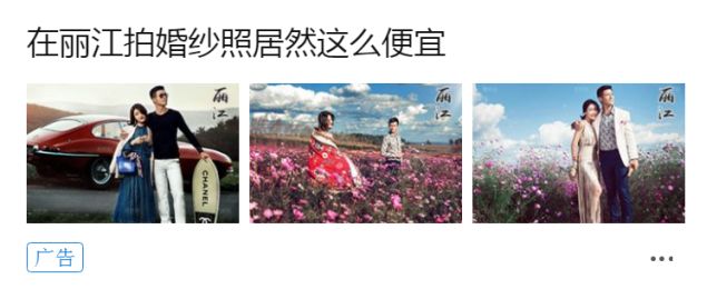 除了用户的匹配度更高,腾讯新闻广告单图文广告、三小图广告、通栏大图广告的展现形式也十分适合婚纱品牌对样片展示的需求。经过测试,奢邦选择了“三小图广告”广告位进行正式投放。而设计师也为奢邦定制化设计了一组具有连贯性的组图,展现了一对情侣抵达丽江、在花海摄影的过程,同时结合文案区域突出在丽江拍婚纱照的性价比,吸引潜在旅拍目标用户关注了解。