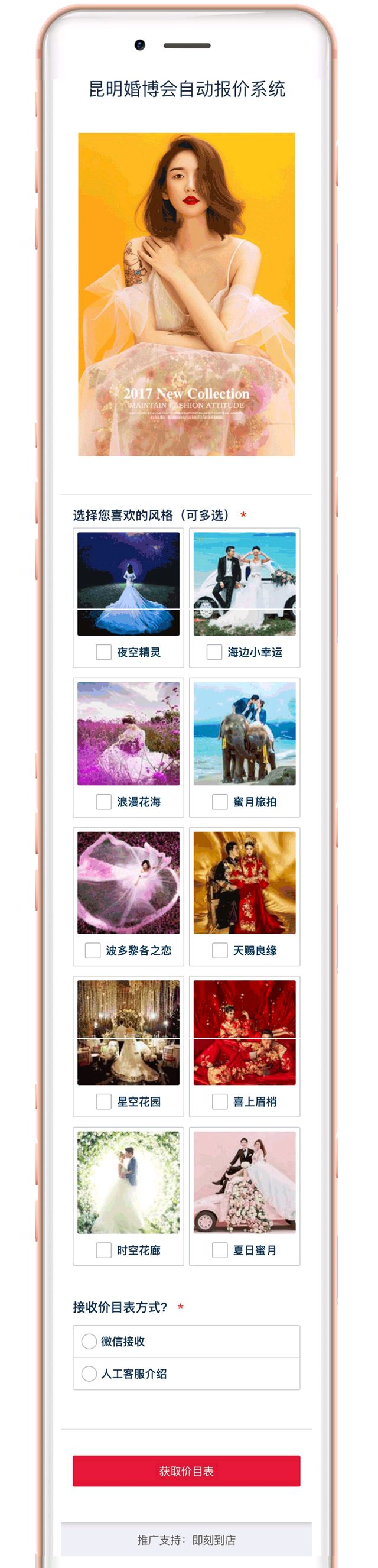 在落地页中,用户可以选择自己喜欢的摄影风格,并留下联系方式获取报价,奢邦则会根据联系方式与用户进一步沟通。