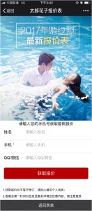 宽定向拓展受众 由于广告主对客咨数量要求较高,故采用“年龄+联网方式+地域”或“性别+年龄+联网方式+地域”的宽定向投放方式,力求最大限度向潜在用户曝光。 在落地页的设计上,广告主用静止优美的婚纱摄影作品作为主画面,吸引用户目光的同时,体现了品牌的实力,增强了信任感;而整个页面采用了简洁的表单形式,用户只需要输入姓名、手机及QQ/微信即可完成填写,降低了用户的填写成本,从而提高了目标用户的填写率。