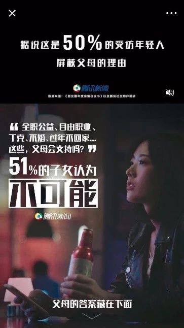 晚八点感性时刻,朋友圈广告直戳人心号召行动:话题经社交平台发酵拥有一定反响后,百威微信朋友圈广告晚8点准时上线,在人们最感性的夜晚上线让用户和品牌内容进行情感交流。朋友圈外层图文针对父母和子女定制两套素材定向投放;内层通过视频感性内容的引导,在朋友圈广告的最后直接向用户提示立即打电话联系父母,号召年轻人踏出打开心扉好好沟通的第一步。当用户通过H5键盘页面拨打电话后,系统还会根据电话时长赠送不同面值的百威促销优惠券,让用户通过一则广告即可完成“从心到脑再到手”的完整转化路径。 腾讯新闻原生内容能力,挖掘话题社会深度,打造品牌社会关怀 。 如果说跨平台话题的广度曝光与深度讨论已经达成了初步的传播效果,那么腾讯新闻对于年轻人的实地街采、专栏内容和深度访谈等形式,则进一步利用自身优质的原生内容创作力及社会营销话题的能力,为活动推波助澜。 顺着对“圈内人”感情话题是与非的层层递进,腾讯新闻陈晓楠的《和陌生人说话》栏目视频“爸妈,谢谢你们尊重我”承接推出,刷遍朋友圈,上线仅一天观看量就破千万,可见触动人心的内容永远都是最有力量的营销武器。 在特制的竖版视频中,陈晓楠深度对话四对不同矛盾的热点人物家庭:在球场叱咤风云的郎平 ,生活中只想做一个平凡的母亲;建筑师世家出身的马伯骞,却毅然决然走向说唱歌手的路;不得不接受女儿出柜的单亲妈妈以及从小与爸爸分隔两地从不知道该如何与父亲沟通交流的儿子,通过特写他们的故事,将百威活动主题进一步升华,号召人们打开心扉,做最真实的自己。