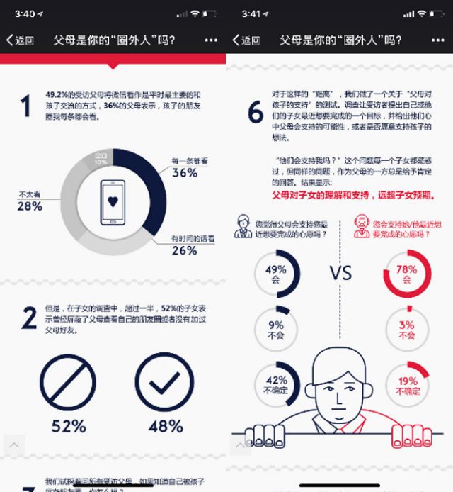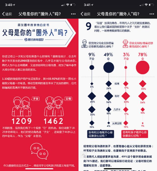 2.引爆日当天节奏三步走: 早八点通勤路,社交洞察引发思考:借力腾讯社交大数据及新闻社会调研结果,腾讯新闻发布了权威的《朋友圈年度亲情白皮书》。白皮书里提出“父母是你的圈外人吗”,表达方式也由有理有据地论述变成由此及彼地反问,逐步引导网友表达出自己最真实的观点。