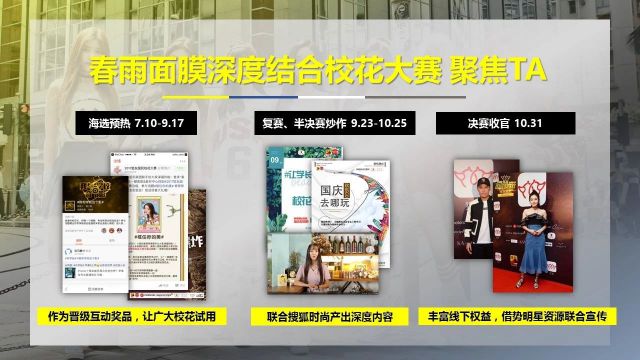 春雨是一款来自韩国的化妆品,主打产品为天然蜂蜜面膜,其潜在消费人群主要是年轻以及对天然原料产品兴趣度较高的女性。自2015年在中国区创立品牌以来,广告主希望通过营销手段吸引目标群体的快速关注并产生购买意向,将春雨面膜的行业地位提升为现象级爆款产品。 那么,在与市场上同类护肤产品的激烈竞争中,春雨面膜是如何提升品牌知名度的呢?在 2017狐友国民校花大赛中,借势评选活动的KOL影响力,通过优质内容互动、多端资源矩阵式传播,搜狐为春雨面膜一手打造 迪奥公关危机“校花的美肌秘密”合作推广,借助引人关注的校花群体,帮助广告主成功锁定年轻女性消费人群。 校花KOL强势吸睛,深度IP精准触达 凭借强大的时尚娱乐基因,搜狐始终与年轻人在一起。春雨面膜主打学生人群,与狐友国民校花大赛选手及关注人群高度契合,在海选预热期,搜狐将春雨面膜定为晋级奖品,邀请十大优质校花选手试用,借助KOL的人气,为春雨面膜打call。此次活动,覆盖全国超过200所高校,近4万名选手参与报名,通过品牌强势曝光,精准触达高校潜在消费群体。