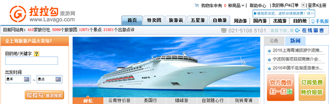 关于拉拉勾 拉拉勾旅游网,成立于2009年3月,是上海大型的网上旅游超市,每天上架400+旅行社的10000+旅游团供网友在线挑选、比价、预订;每年有数十万游客通过拉拉勾旅游超市预订出游。