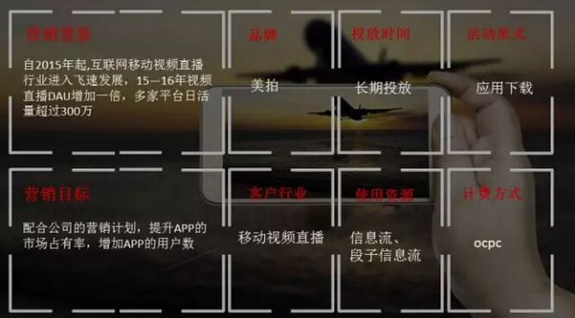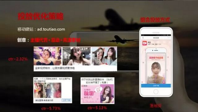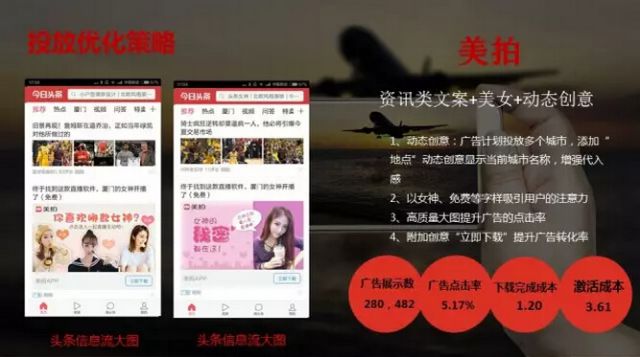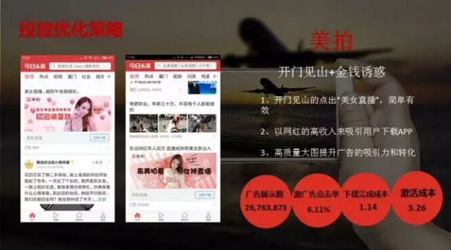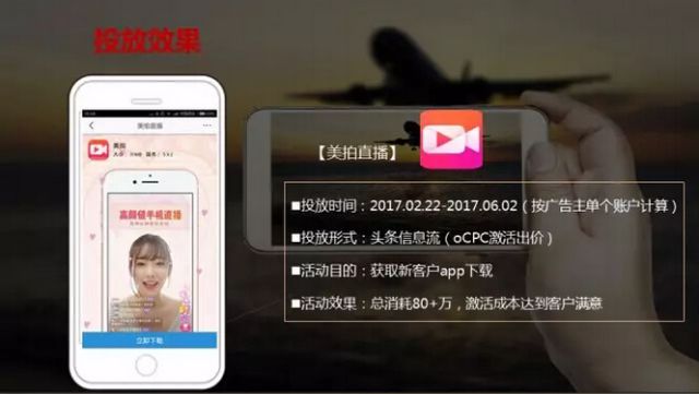 自2015年起,互联网移动视频直播行业进入飞速发展,15-16年视频直播DAU增加一倍,多家平台日活量超过300万,美拍使用在今日头条投放广告,获取新客户APP下载,在4个月的时间内,投放广告费80万+,取得了满意的激活效果。 投放时间:2017.02.22-2017.06.22(按广告主单个账户计算) 投放形式:头条信息流(o激活出价) 活动目的:获取新客户APP下载 活动效果:总消耗80+万,激活成本达到客户满意