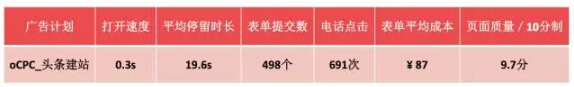 数据来源:广告主投放后台数据 头条建站落地页效果 使用头条建站推广oCPC不仅可以减少技术对接成本,自动识别表单、电话、按钮等转化目标,轻松优化转化成本,而且头条独有的技术可以帮助广告主提高落地页质量,助力提升转化效果。 通过页面质量检测工具发现,该落地页综合得分9.7分,广告投放竞争力强。具体效果指标数据见表1。 表1 头条建站落地页效果数据