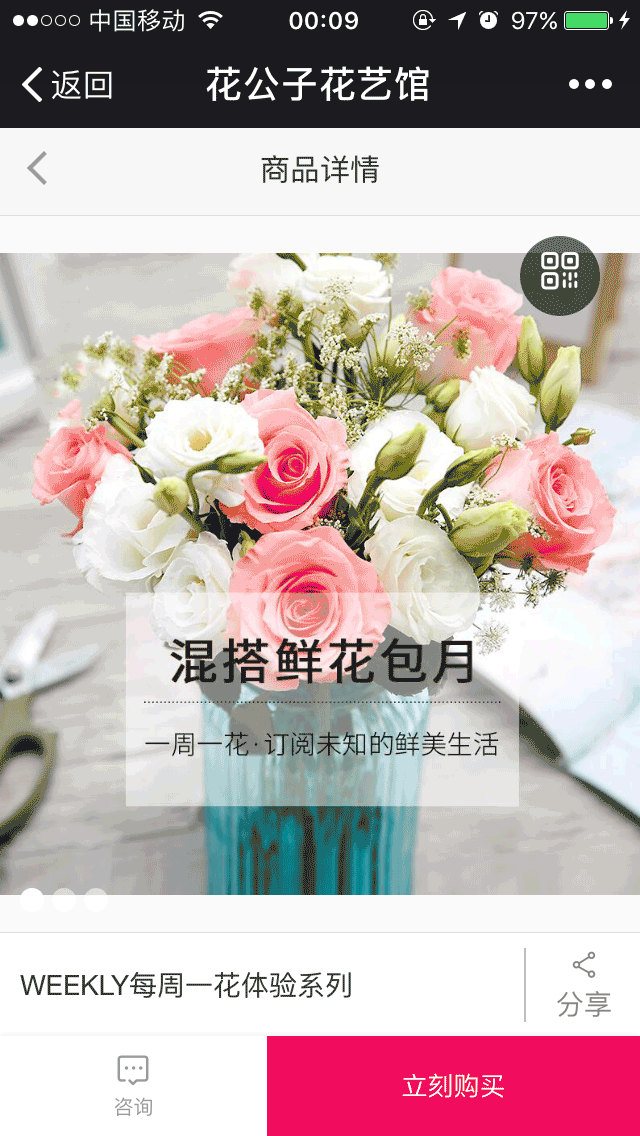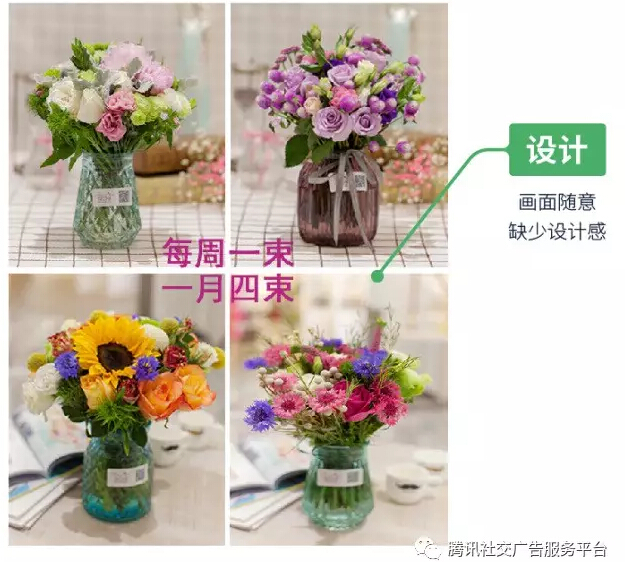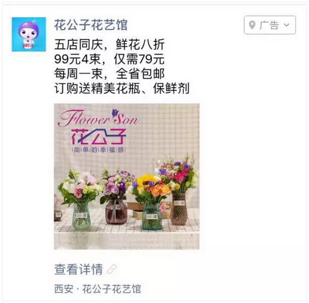 综合以上考虑,我们给出了如下建议:利用“查看详情”功能,增加朋友圈广告跳转到线上商城的入口;通过LBS定位功能,展现门店信息;通过线上商城与线下门店的同步推广,精准的网络营销打通线上线下销售渠道,形成营销闭环。花公子也欣然接受了这个建议,于是就有了本文开篇的一幕。 明确了推广策略之后,接下来的工作就水到渠成了。 花公子的广告覆盖范围最终选定在了:西安市雁塔区、未央区、碑林区、莲湖区、长安区政府、临潼区全都购物广场(人民南路店)。这样的选择一方面是考虑到目标消费者在上述区域内更加集中,可以兼顾曝光量与精准定向;另一方面,在这些区域,花公子可以实现更加完善的配送服务,提升客户体验。 在广告创意上,我们也帮助花公子进行了系统优化: 优化前: