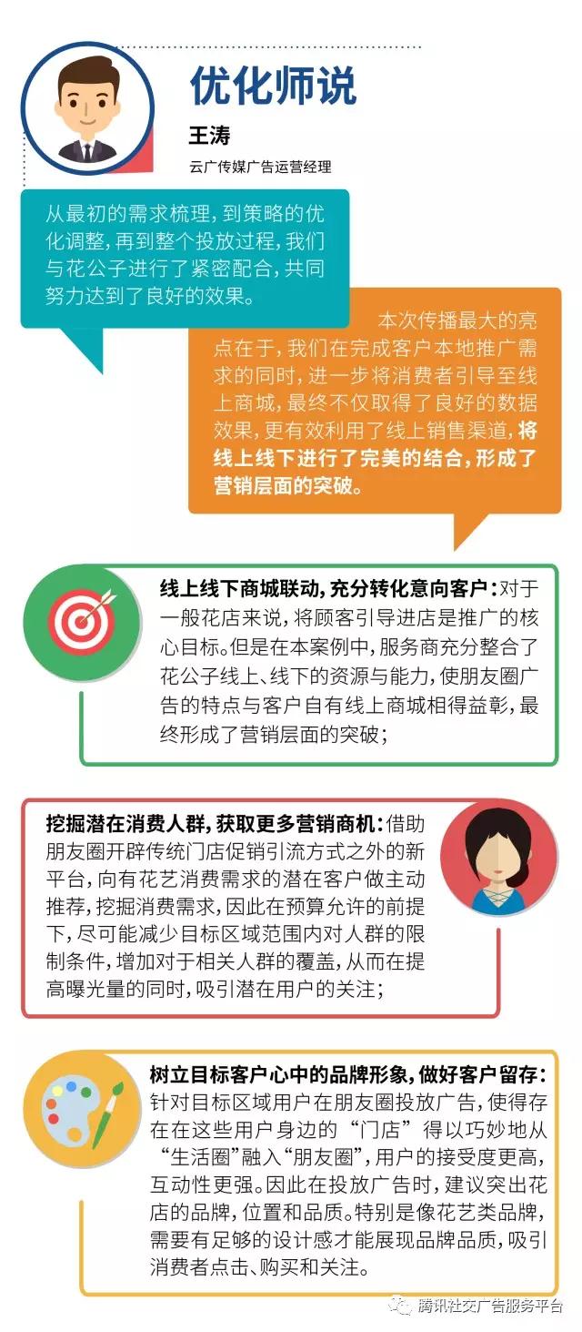 2017年5月,正值花公子成立周年庆,急需配合周年庆进行一次有效地大规模推广。那么,有没有一种区别于以往的推广形式,能够兼具传统推广形式的优点,同时能够避免其短板呢?在考察和了解了诸多推广手段后,花公子市场营销总监将目光聚焦在了微信,于是找到了授权服务商深入了解朋友圈广告,发现微信朋友圈广告十分满足公司现阶段的推广需求: 微信平台有着广泛的用户基础,可以覆盖尽可能多的人群;腾讯社交广告平台的海量数据和定向技术,可以精准地锁定目标人群;沉浸式的展现形式就如同一条普通的朋友圈信息,更容易让用户接受;微信平台可以在团购、点评网站以外开辟新的“战场”,从而避免与竞争品牌扎堆宣传。综合考虑以上因素,花公子决定利用朋友圈广告完成此次周年庆推广活动。 同时,为了取得更好的朋友圈广告效果,花公子决定和腾讯社交广告平台合作,开始此次推广,腾讯社交广告平台当地代理商的广告销售经理和广告运营经理立刻进行对接, 深入了解花公子的营销需求,制定了营销方案。 在正式进行朋友圈广告投放前,花公子计划将目标消费者定义为25岁-45岁、拥有一定消费能力,并具有很高生活情调的家庭、白领女性用户。腾讯社交广告平台运营经理王涛、广告销售顾问闫雄召在经过调研后,发现45岁-50岁年龄段女性人群出于对于高品质生活的要求、走亲访友购买礼品等原因,对鲜花也有很大的购买需求,于是建议将年龄段扩大到25岁-50岁——这样不仅扩大了吸引潜在客户的机会,也可以进一步提升曝光量,对于品牌认知度的提升也会有一定的促进作用。