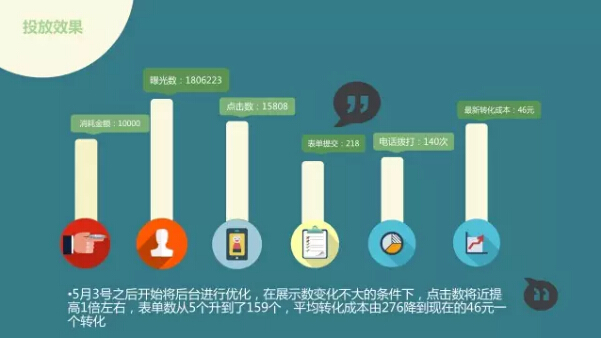 投放效果 消耗金额:10000 曝光次数:1806223 总点击数:15808 表单提交:218 电话拨打:140次 最新转化成本:46元