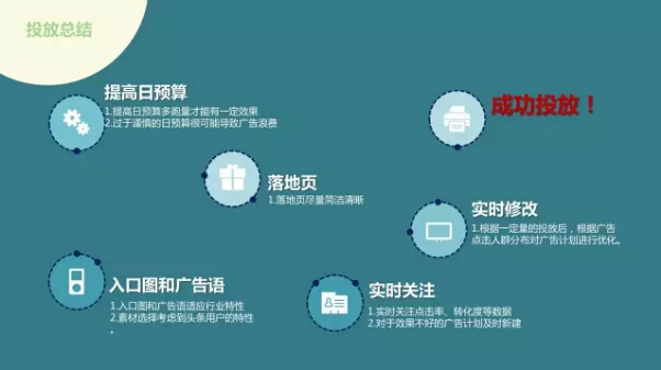 投放总结 1、提高日预算 1)提高日预算多跑量才能有一定效果 2)过于谨慎的日预算很可能导致广告浪费 2、落地页尽可能简洁清晰 3、实时修改:根据一定量的投放后,根据广告点击人群分布对广告计划进行优化 4、入口图和广告语 1)入口图和广告语适应行业特性竞价流量 2)素材选择考虑到头条用户的特性 5、实时关注 1)实时关注点击率、转化度等数据 2)对于效果不好的广告计划及时新建