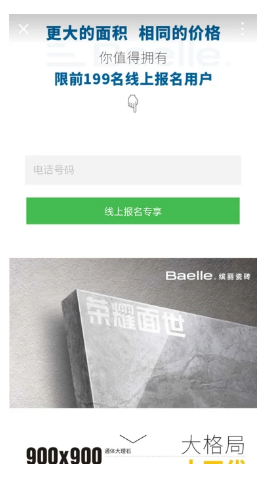 家居行业在现在市场推广越来越难,竞争对手的增多,精准客户获取不易。接下来我们看家居行业如何利用微信进行引流,达到线上线下营销的效果。缤丽人生陶瓷将品牌定位于高端市场,立志生产精致化产品,始终专注于产品花色及工艺的创新研发。凭借“创新产品设计”,以及独特的品牌文化,立足于建陶行业前列。公司拥有专业的产品研发团队,所开发的新产品备受大众关注和喜爱,也正在成为行业新产品开发的风向标。 缤丽人生陶瓷新店开业,经销商想进行开业宣传,但线下推广成本费用太高,如何找到其他有效的营销方式进行线上引流到线下,成为经销商要解决的重要问题。因为微信的社交属性与流量优势,缤丽人生选择了在微信朋友圈投放广告。选择在投放对于缤丽人生陶瓷来说也是一个挑战,如何在没有投放腾讯社交广告的经验下快速获得意向用户!如果您没有广告投放经验可以选择与上海联系,我们有专门的优化师团队,每个优化师都是有着丰富的行业投放经验。 腾讯社交广告营销目标: 因为是实体店引流,于是选择限定地域投放。首先增加品牌曝光,提升品牌知名度;然后通过表单收集客户信息,进而电话销售跟进,引导客户进店体验,最终实现新店到店率的提升。 腾讯社交广告投放方案 1.引流线下实体店,提升到店率 缤丽人生陶瓷新店开业,希望能够获得更多线下流量。考虑到腾讯社交广告全场景用户覆盖、全方位数据剖析、精准化定向的营销优势,缤丽瓷砖决定将社交推广的首次尝试交给腾讯社交广告——微信朋友圈广告。经过沟通确定腾讯社交广告的实施策略为:通过微信朋友圈广告强势曝光爆款产品,吸引意向客户自主填写信息收集表单;获取用户信息后,进一步电话沟通;在吸引用户参加开业活动的同时,方便再营销跟进。 2.爆款低价活动,吸引用户参与 缤丽瓷砖主打“爆款低价”、“限时促销”口号进行客户资料获取,文案创意和内容制作也花了很多心思: (1)用“缤丽800金刚石,这个价格,你知道是什么概念吗?”作为微信朋友圈广告外层文案,一句话点明产品信息,利用疑问式的对话有助于吸引用户的好奇心,引发用户点击查看落地页。 (2)外层图片以精美的瓷砖为主视觉,将色彩进行强烈对比,展示了产品的买点,图片文案更是懂点突出价格优势,紧抓用户眼球。