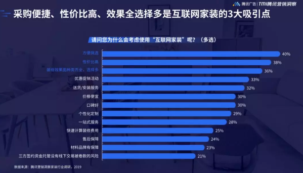 4.传统与互联网家装:传统仍是主流,互联网家装深入各梯级市场 腾讯营销洞察数据显示,传统家装在当下仍凭借便捷的售后、送货、安装服务受到77%的消费者青睐。在信息即刻而得的移动互联时代,便捷、性价比高、效果图丰富齐全的的互联网家装目前已融入各梯级市场,加速向传统家装渗透,正受到越来越多一线城市、90后群体的追捧。但是消费者对于信息透明度不高、装修材料质量的标准不透明、尤其是二线城市消费者对于售后服务等方面的顾虑,导致互联网家装的份额与传统家装的占比相比仍有较大差距。