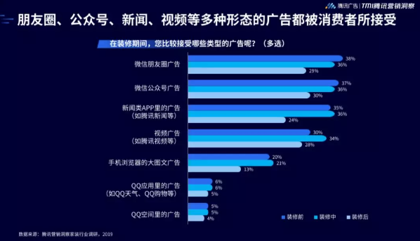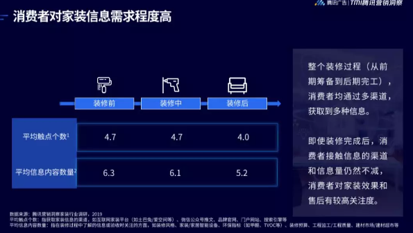 而在互联网普及程度较高的苏浙闽三省,消费者获取家装信息的触点和信息渠道相对较多,同时三省数量庞大的年轻群体及有孩家庭需求也更为多元,故而对家装的需求复杂度要求更高。 基于以上洞察,腾讯营销洞察团队在报告中为家居行业未来营销规划给出了三大关键建议: 数据驱动: 1.通过数据挖掘,掌握潜在最佳沟通时机 2.洞悉细分群体需求,以针对性素材实现亲密沟通 3.做好投放监测,充分利用数据结果优化广告投放 线上与线下有机配合提升效率: 夺目的线上传播打动受众前往线下做出选择决策,进一步输出口碑到线上形成正向循环 针对不同人群差异化诉求制作沟通内容: 1.风格、环保、智能、性价比都是可以做进一步针对性提炼的家装核心诉求 2.情感上的可信赖,以及由此获得的轻松生活会是另一个沟通诉求的创意点 洞悉新变化,把握新方向,腾讯广告期望与家装行业伙伴的共同努力,在2019下半年进一步把牢牢握增长机遇,实现营销进击突破。 洞悉新变化,把握新方向,上海期望与家装行业伙伴的共同努力,在2019下半年进一步把牢牢握增长机遇,实现营销进击突破。